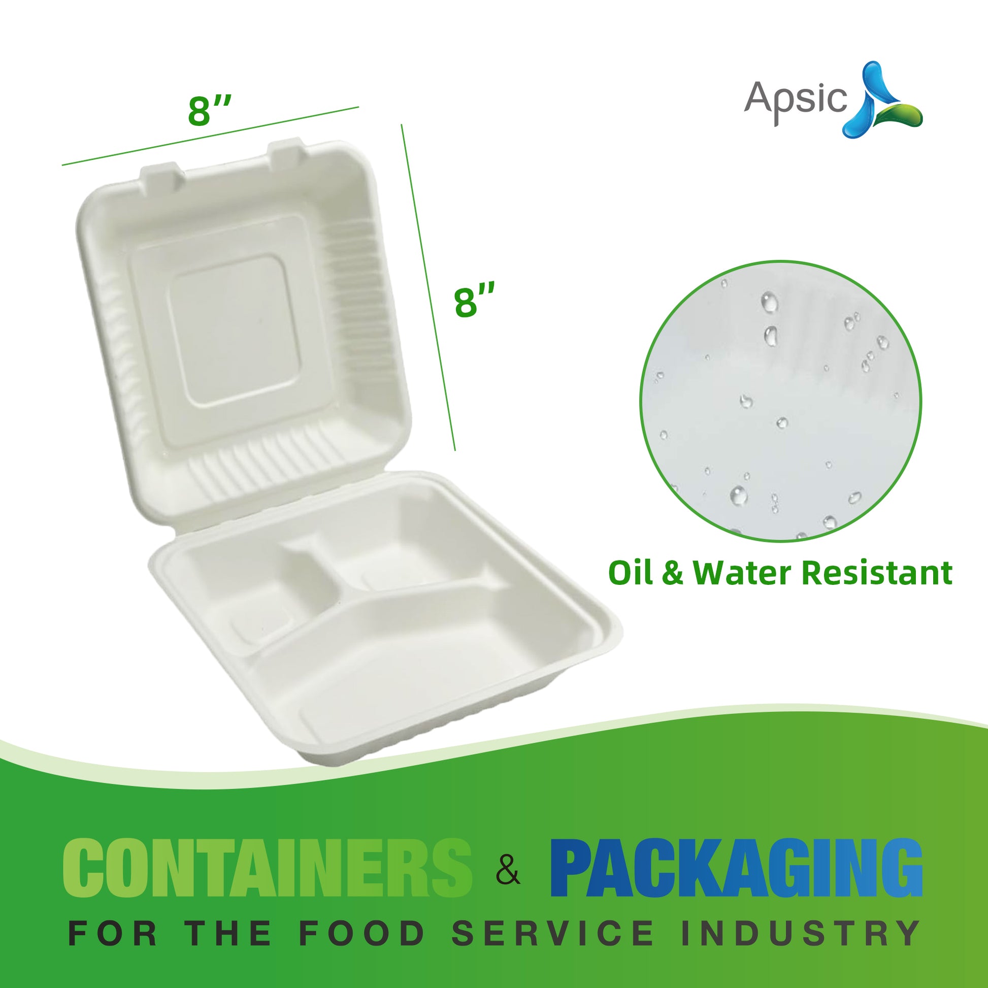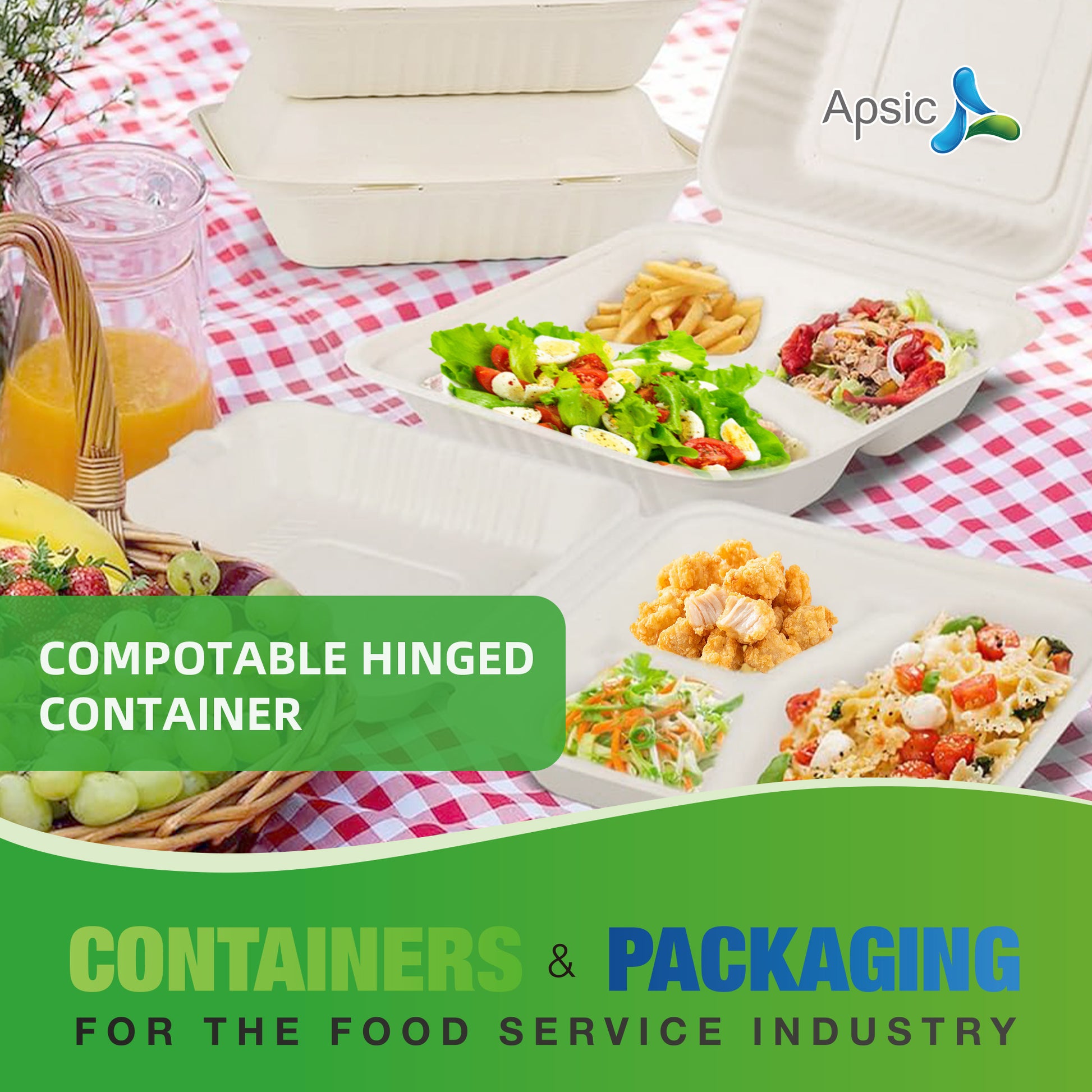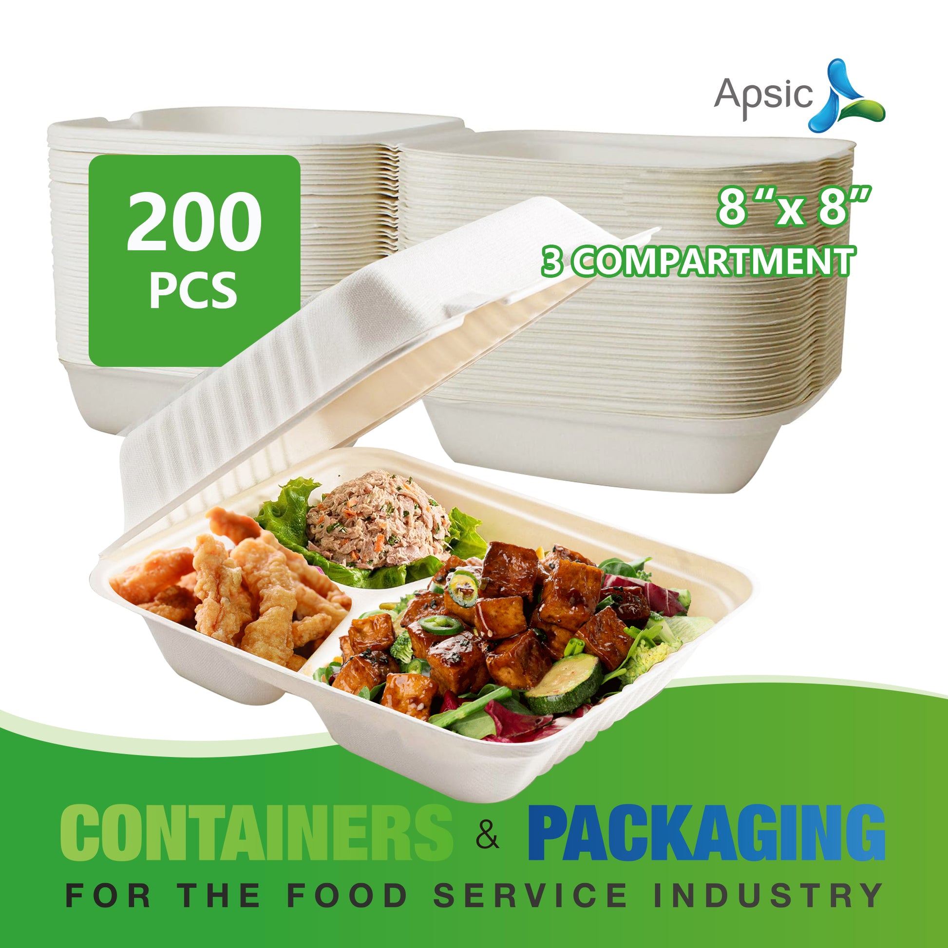 COMPOTABLE HINGED CONTAINER 8x8" 3-COM BAGASSE PFAS FREE