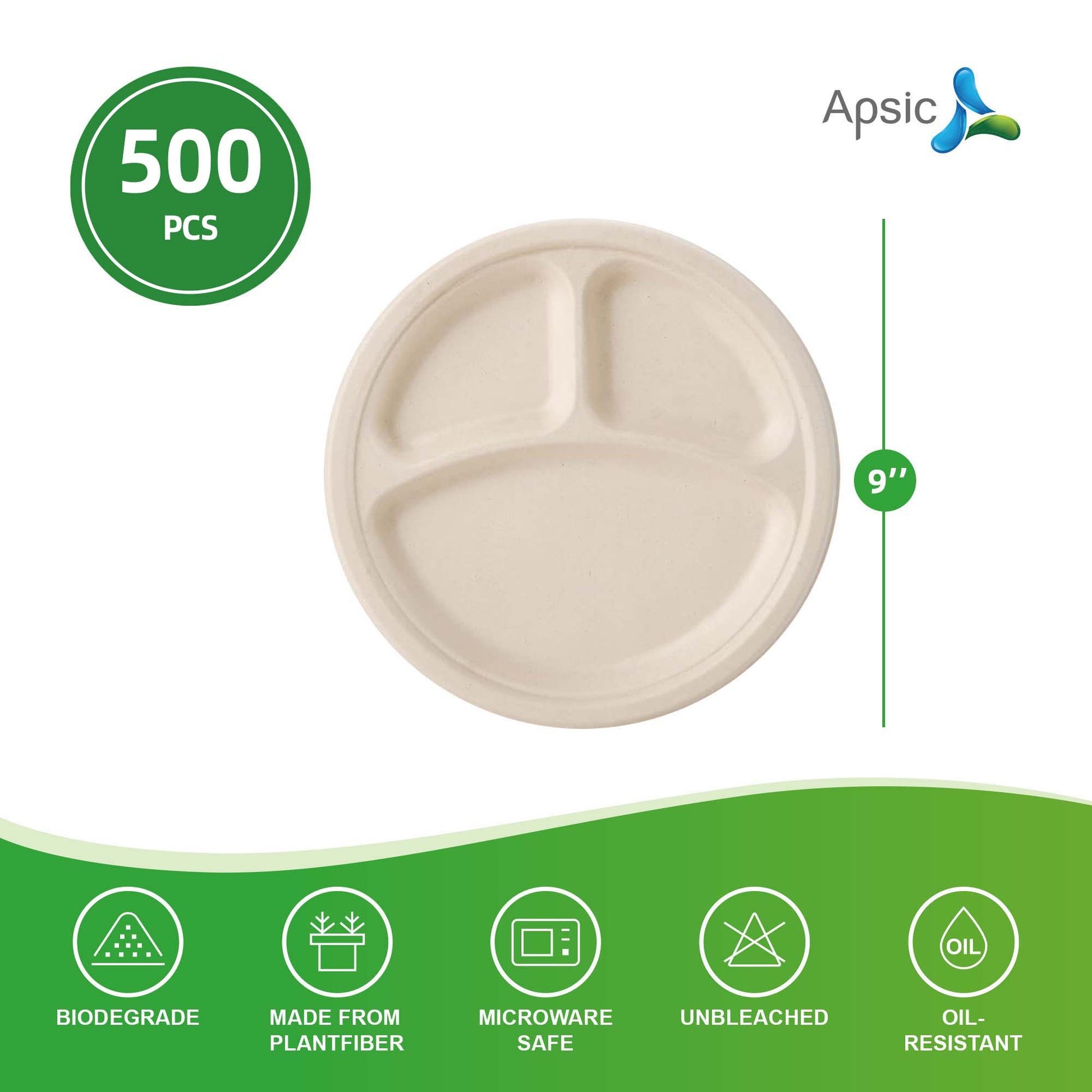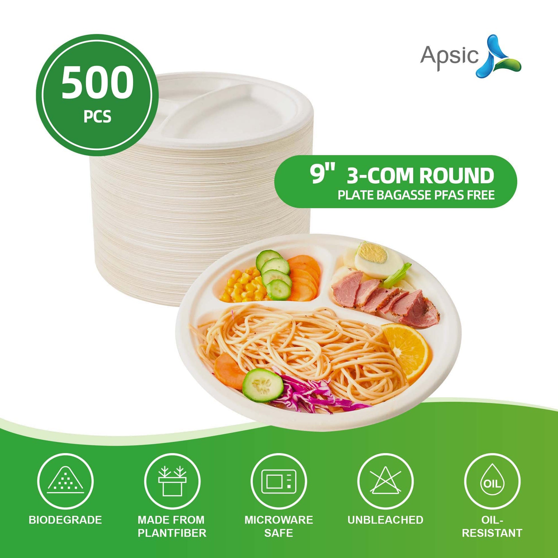 COMPOSTABLE DINNER PLATE 9" 3-COM ROUND PLATE BAGASSE PFAS FREE